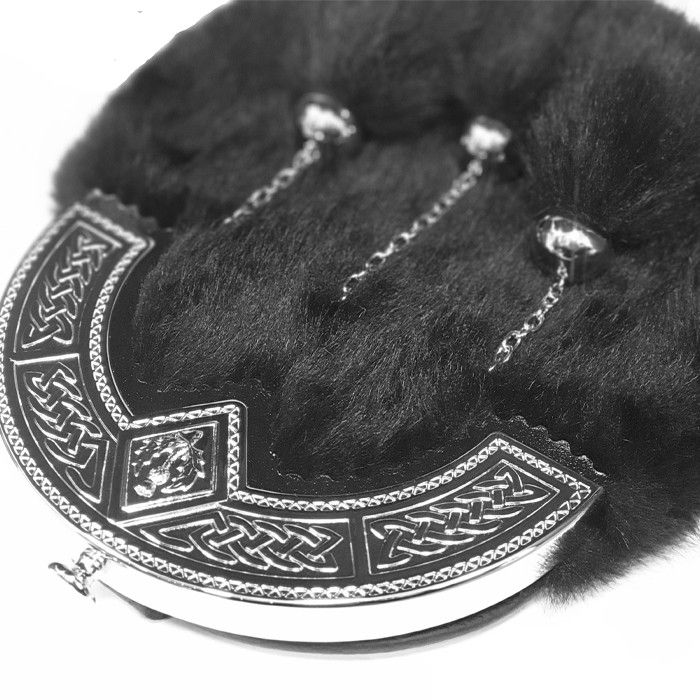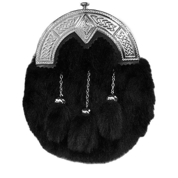 This Dress sporran is made from beautiful Black Faux Fur with 3 matching tassels on chrome chains. It has a highly polished chrome cantle enhanced with a Celtic knot design featuring a diamond shaped shield decorated with a Thistle. This is the perfect sporran to compliment your Wedding outfit or for a Formal Black Tie event or simply give as a gift to someone special. Includes chain strap.
