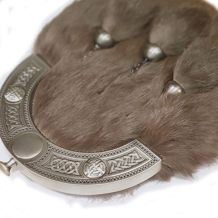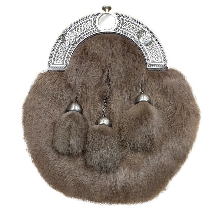 This is the perfect sporran to compliment your Wedding Kilt outfit or for a Formal Black Tie Event. This Dress sporran is made from beautifully soft Faux fur with 3 matching tassels on antique finish chains. It features a antique cantle enhanced with a Celtic knot design and three raised shields. Includes chain strap.