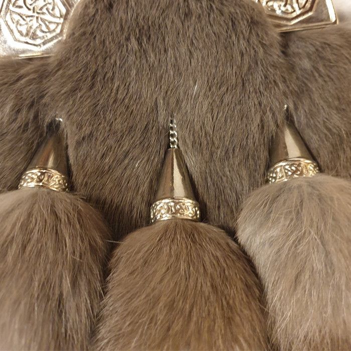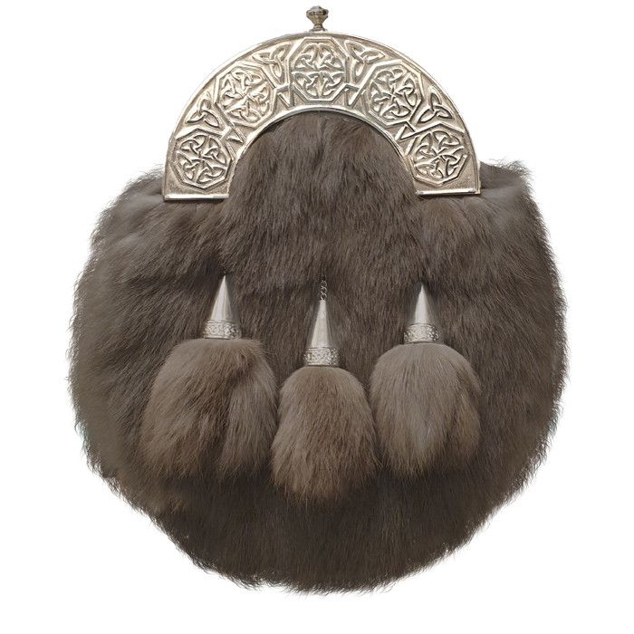 This stunning Dress sporran is made from Faux fur with 3 matching cone tassels on pewter chains. The cantle features a raised Celtic pattern which also features around the top edge of the sporran and the cone tassels. This is the perfect sporran to compliment your Wedding outfit or for a Formal Black Tie event or simply give as a gift to someone special. Includes chain strap.
