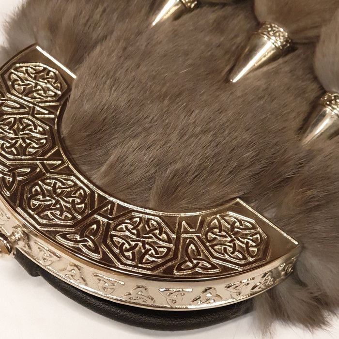 Expertly crafted for traditional Scottish attire, this Faux Fur Dress Sporran adds a touch of luxury with its intricate Celtic Design Cantle in Antique Polished Finish. The leather chain strap allows for comfortable wear, making it perfect for formal occasions. Upgrade your highland ensemble with this stunning piece.