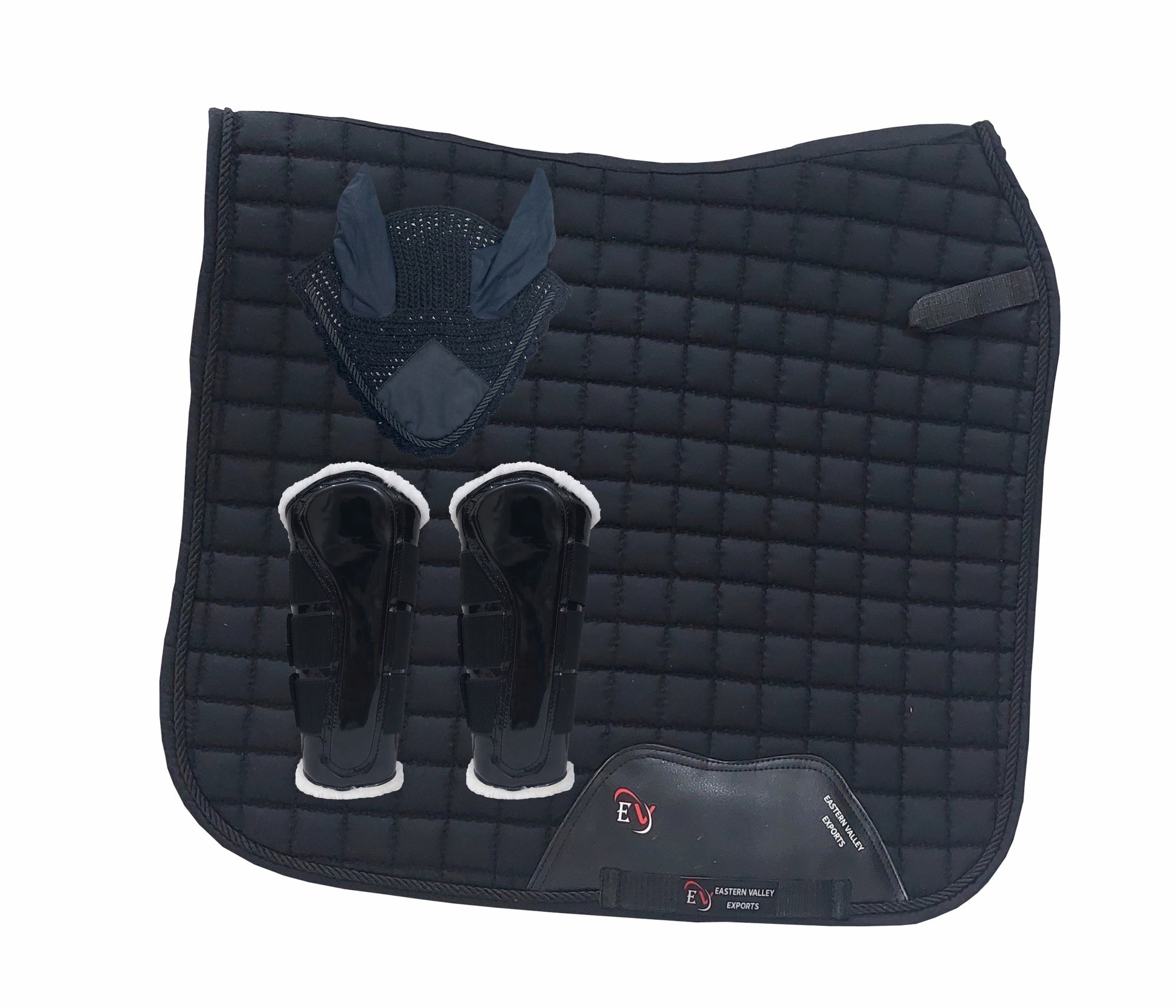 Horse Saddle Pad Set including Fly Veils & Tendon Boots, Black Cotton Quilted - Dressage