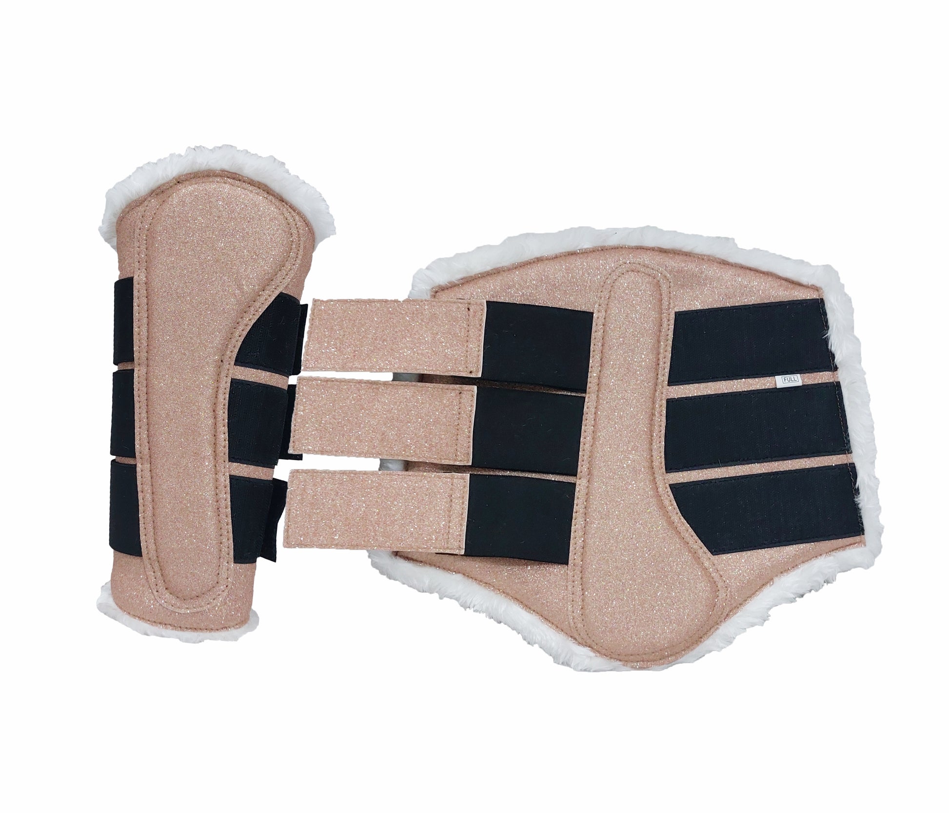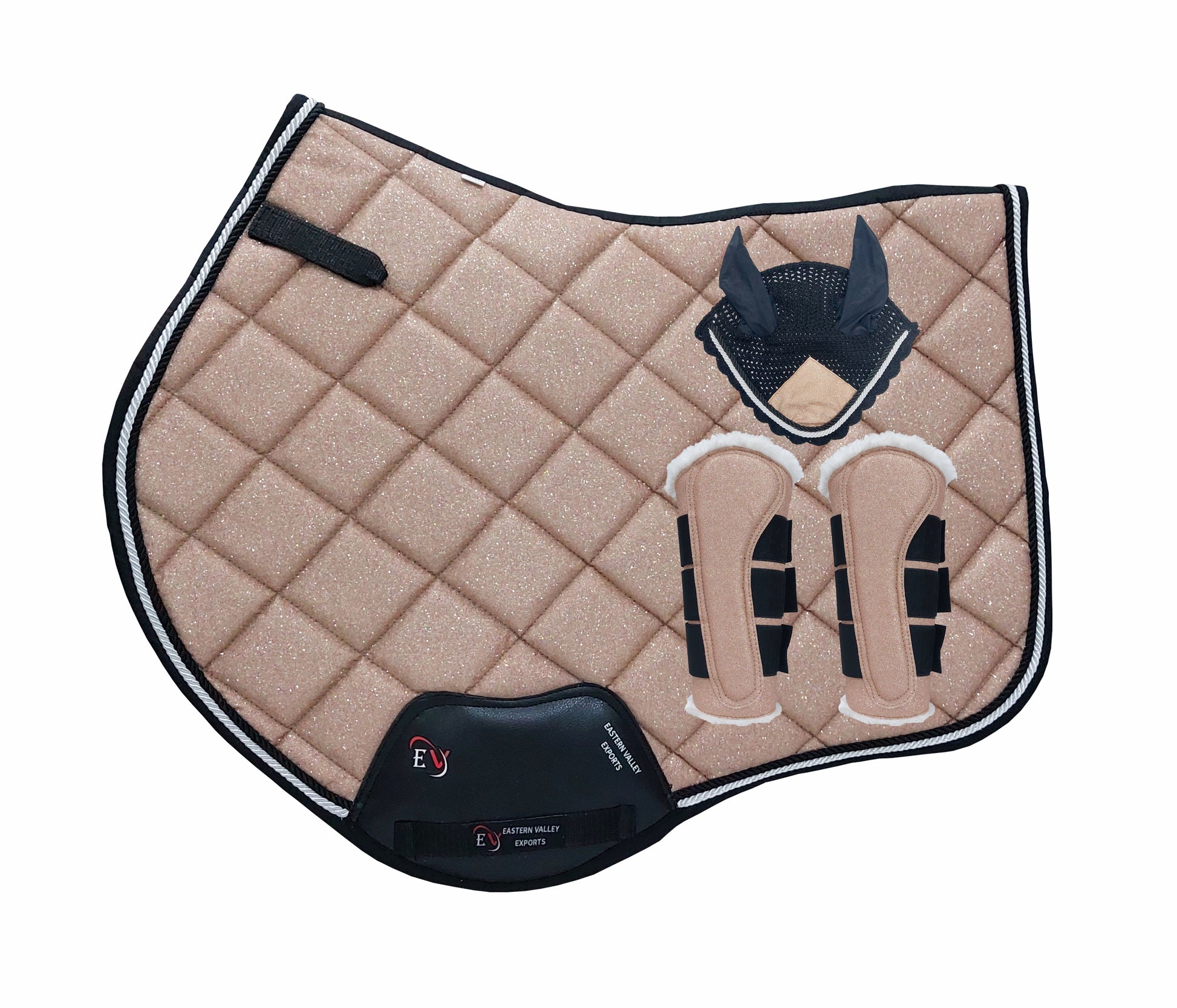 Expertly designed Horse Saddle Pad with added benefits of Fly Veils and Tendon Boots. Made with shiny glitter golden, providing both style and comfort for your horse. Perfect for Jumping events, this set ensures optimal protection and support.
