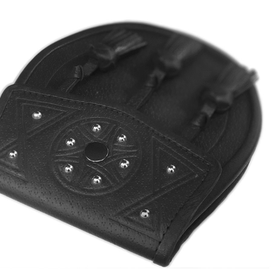 Leather Day Sporran Tooled and Studded Celtic design with 3 Knotted Tassels in Black with Leather Chain Strap
