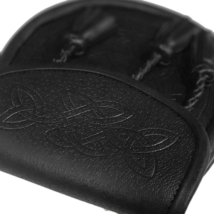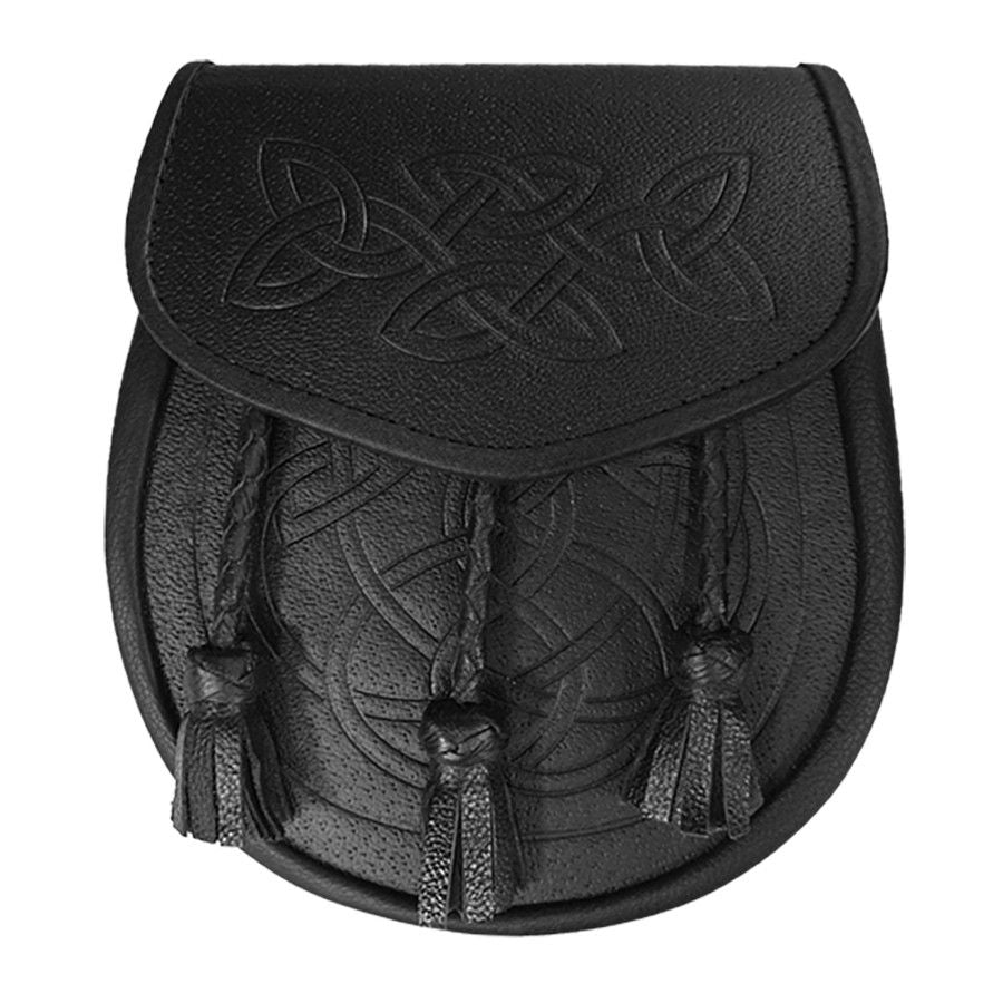 Leather Day Sporran with Embossed Celtic Pattern and 3 Twisted Tassels in Black with Leather Chain Strap