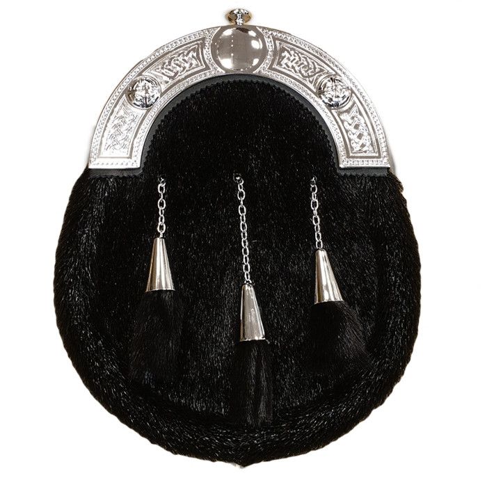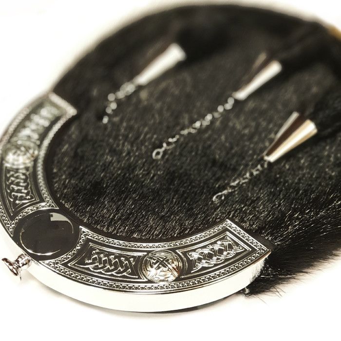 This black leather dress sporran features a striking Celtic dress cantle in a sleek chrome finish, complemented by a durable leather chain strap. Expertly crafted for a polished and traditional look, this sporran adds a touch of elegance to any kilt outfit.