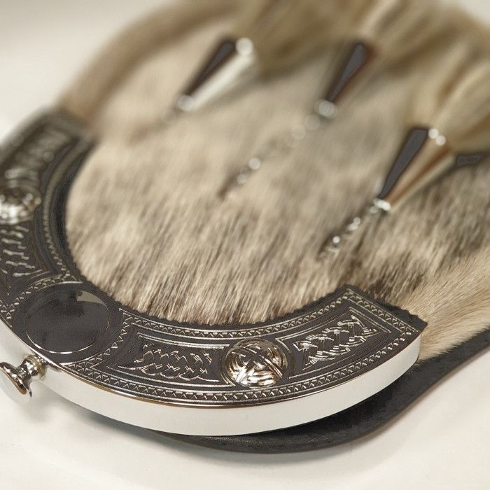 This Leather Dress Sporran features a Celtic Design Cantle in a sleek Chrome Finish, complete with a durable Leather Chain Strap. Perfect for adding a touch of sophistication and tradition to any formal or semi-formal attire. Handcrafted with quality materials for lasting wear.