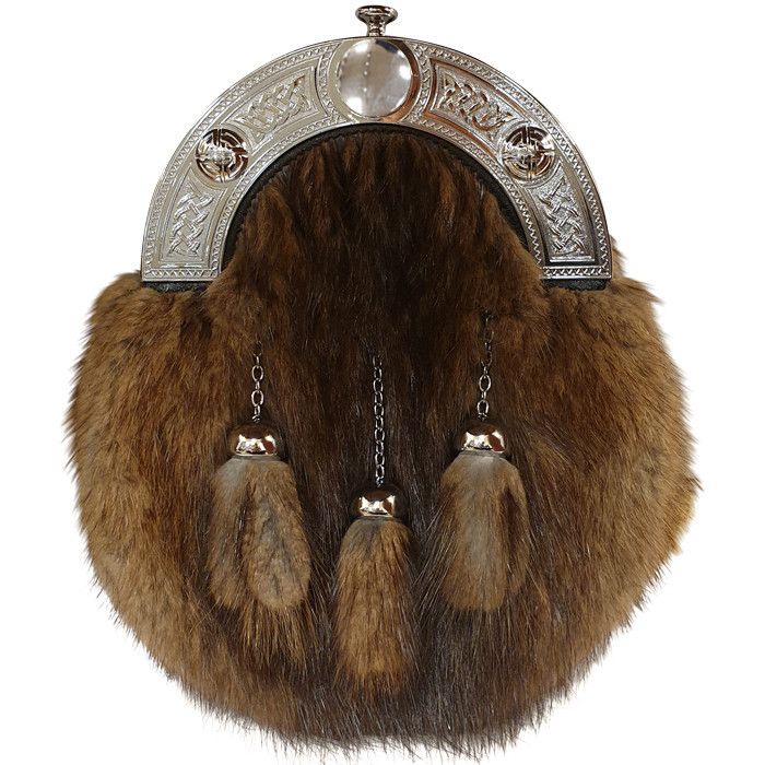 This is the perfect sporran to compliment your Wedding Kilt outfit or for a Formal Black Tie Event. This Dress sporran is made from beautiful Musquash fur with 3 matching tassels on chrome chains. It features a chrome cantle enhanced with a Celtic design. Includes chain strap.
