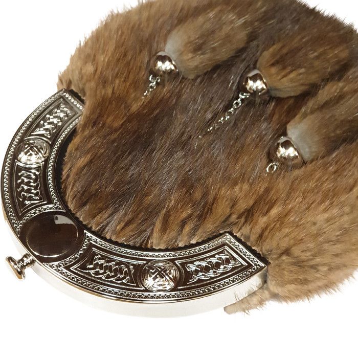 Expertly handcrafted, the Musquash Dress Sporran features a sleek Celtic Cantle design and 3 tassels in a chrome finish. Crafted from premium musquash fur, it comes with a leather chain strap for comfortable wear. Elevate your formal look with this unique and stylish accessory.
