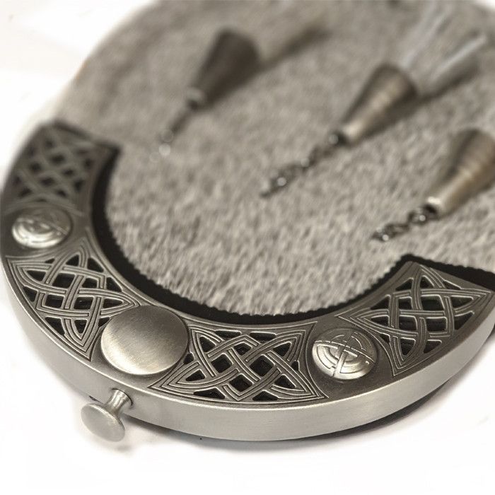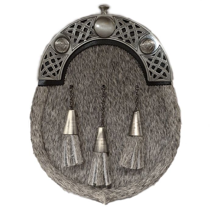 This unusual Dress sporran is made from Pony Skin with 3 matching coned tassels on antique chains. It features an antique finish cantle beautifully enhanced with an intricate open work Celtic Knot design and a three plain brushed shields. This is the perfect sporran to compliment your Wedding outfit or for a Formal Black Tie event or simply give as a gift to someone special. Includes chain strap.