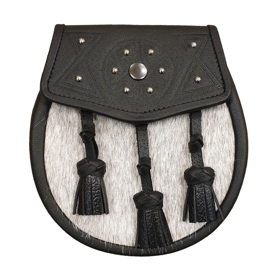 Pony Skin Semi Dress Sporran with Celtic Design Black Leather Flap and Tassels with Leather Chain Strap